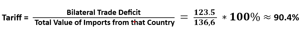 - ε: the percentage change in imports if the price changes by 1%. The White House has chosen ε = 4 (based on the study by Boehm et al., 2023). This means that if the U.S. increases import prices by 1%, the import volume will decrease by approximately 4%.